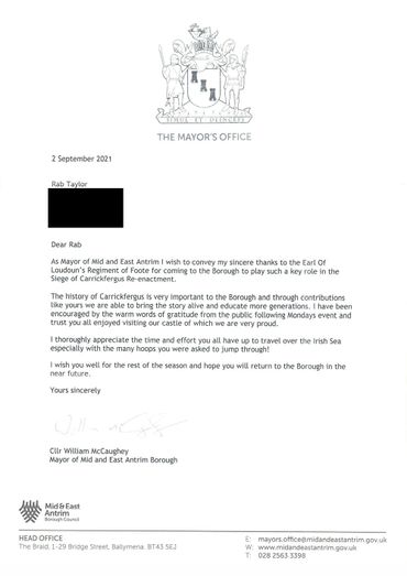 "On behalf of the Charles Edward Stuart Society I would like to pass on our sincere thanks to you and your society for the efforts made in making our Bonnie Prince Charlie weekend the success that it was.Without the continuing support of other societies such as yours we would find it very difficult to create such an enjoyable event that brings so many people to Derby.We have now started to organize next year's event, which is to be held over the weekend 30th November and 1st December 2002. I do hope that, once again, we will be able to count on the support of you and your colleagues and look forward to bringing this part of Derby's history back to life next year."